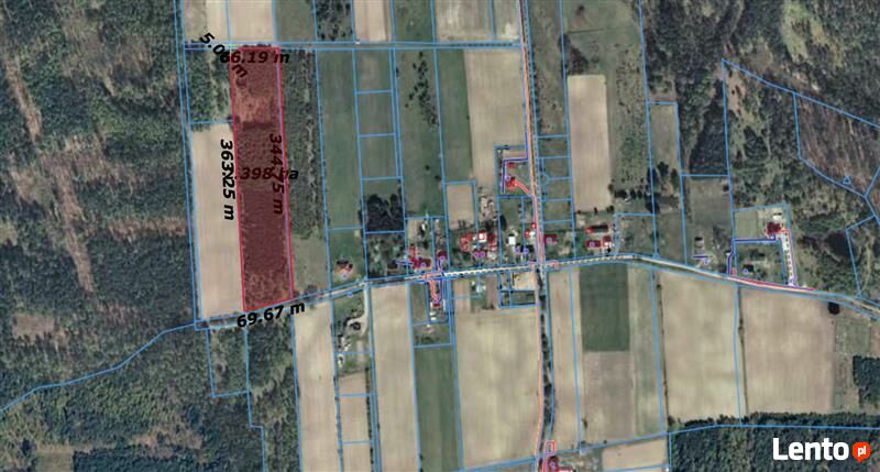 Szerokość działki 69 m, długość działki 363 m. Grunty rolne 3100 m, a pozostałe grunty leśne i lasy o pow. 20 000 m.